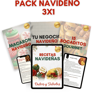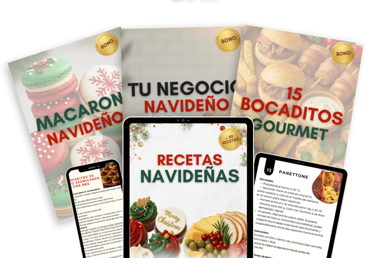 Es un e-book digital en PDF con más de 50 recetas navideñas entre postres, platos salados, guarniciones y bebidas, organizado paso a paso para que puedas armar un menú completo sin estrés.